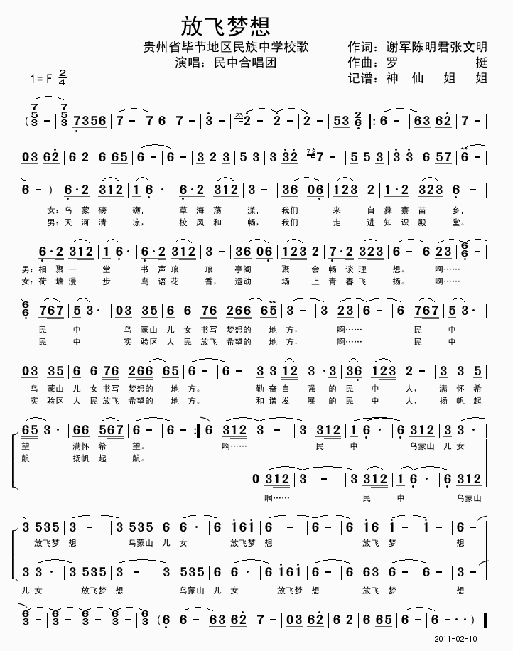《放飞梦想 贵州毕节民族中学校歌》简谱