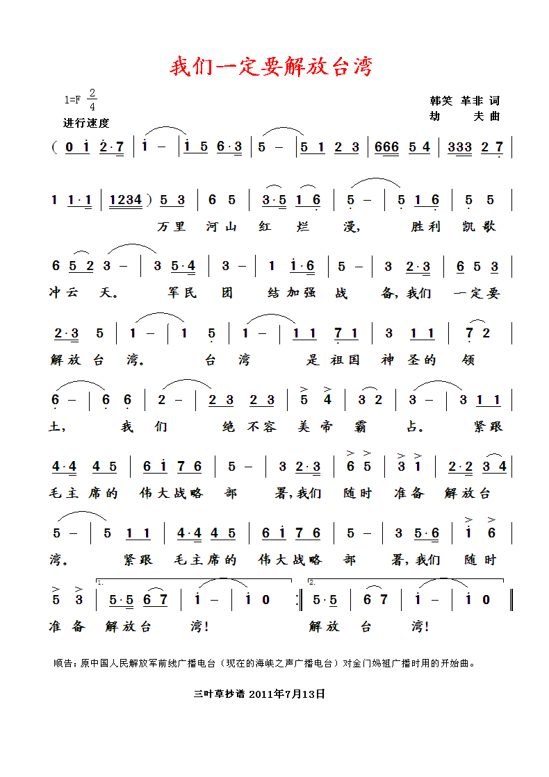 《我们一定要解放台湾》简谱