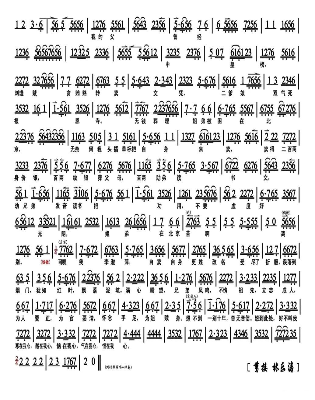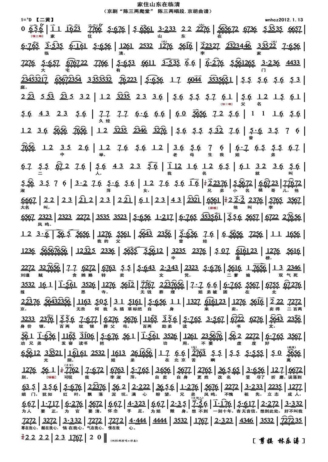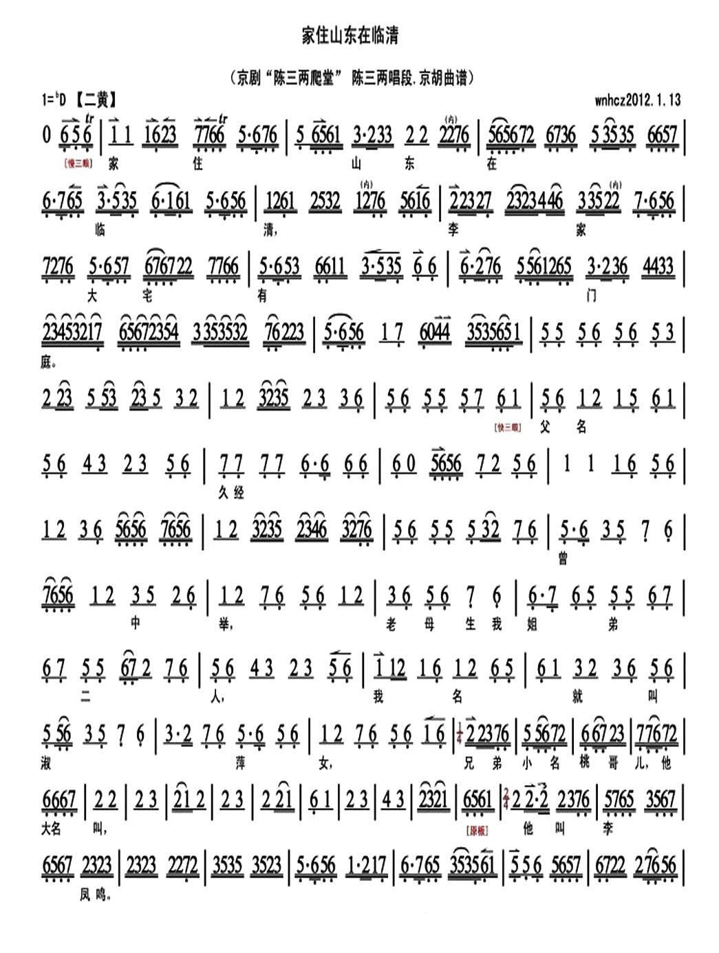 《家住山东在临清(《陈三两爬堂》选段、琴谱)》简谱 刘桂娟