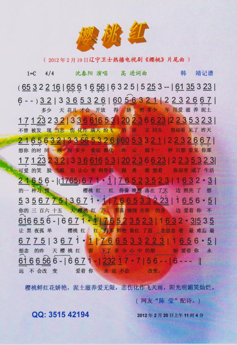 《樱桃红(辽宁卫士热播剧《樱桃》片尾曲)【彩谱】》简谱 沈春阳