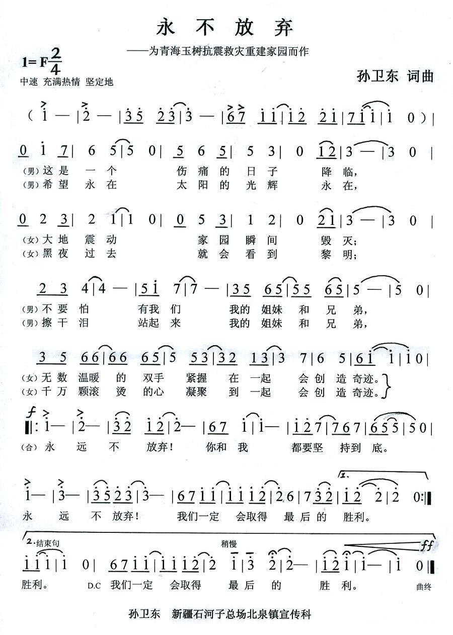 《永不放弃(为青海玉树抗震救灾重振家园而作)》简谱