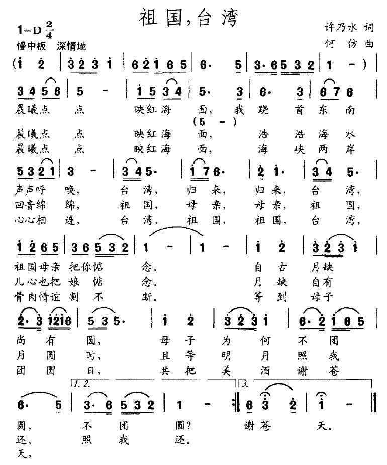 《祖国,台湾(许乃水词 何仿曲)》简谱