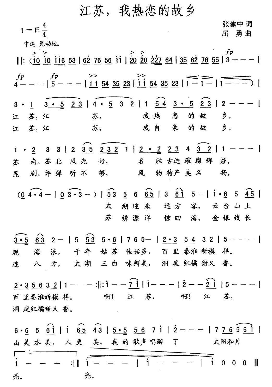 《江苏,我热恋的故乡(张建中词 屈勇曲)》简谱