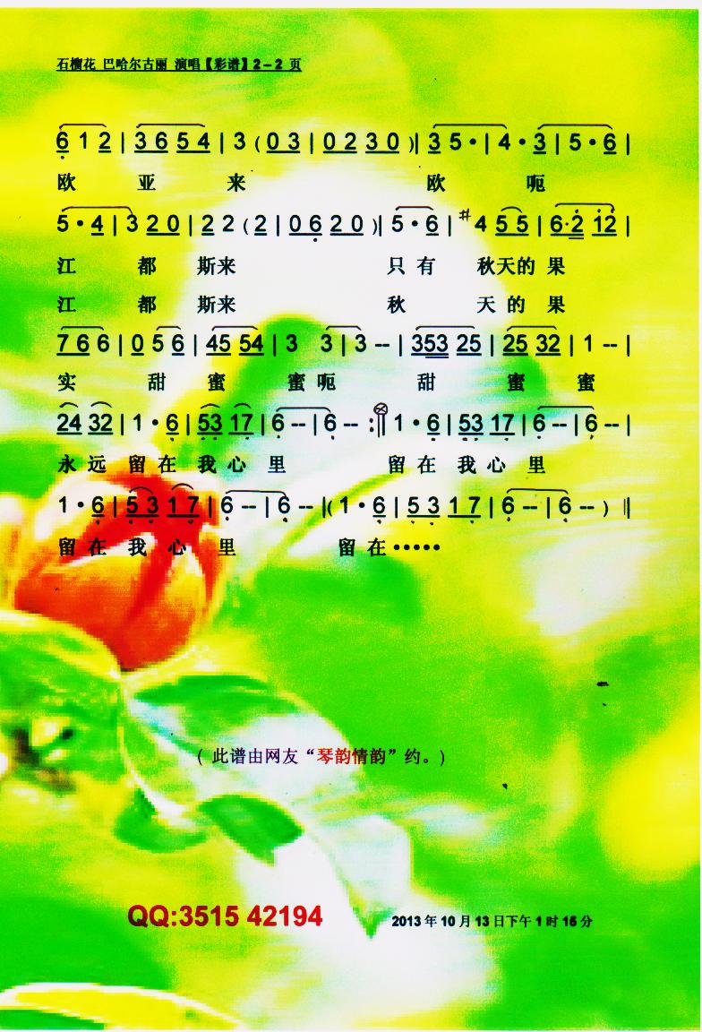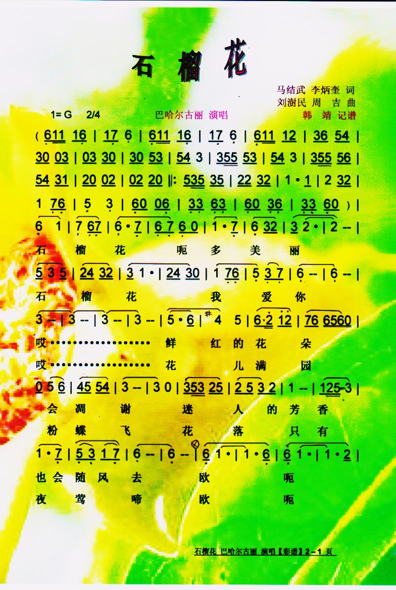 《石榴花(新疆民歌)【彩谱】》简谱 巴哈尔古丽