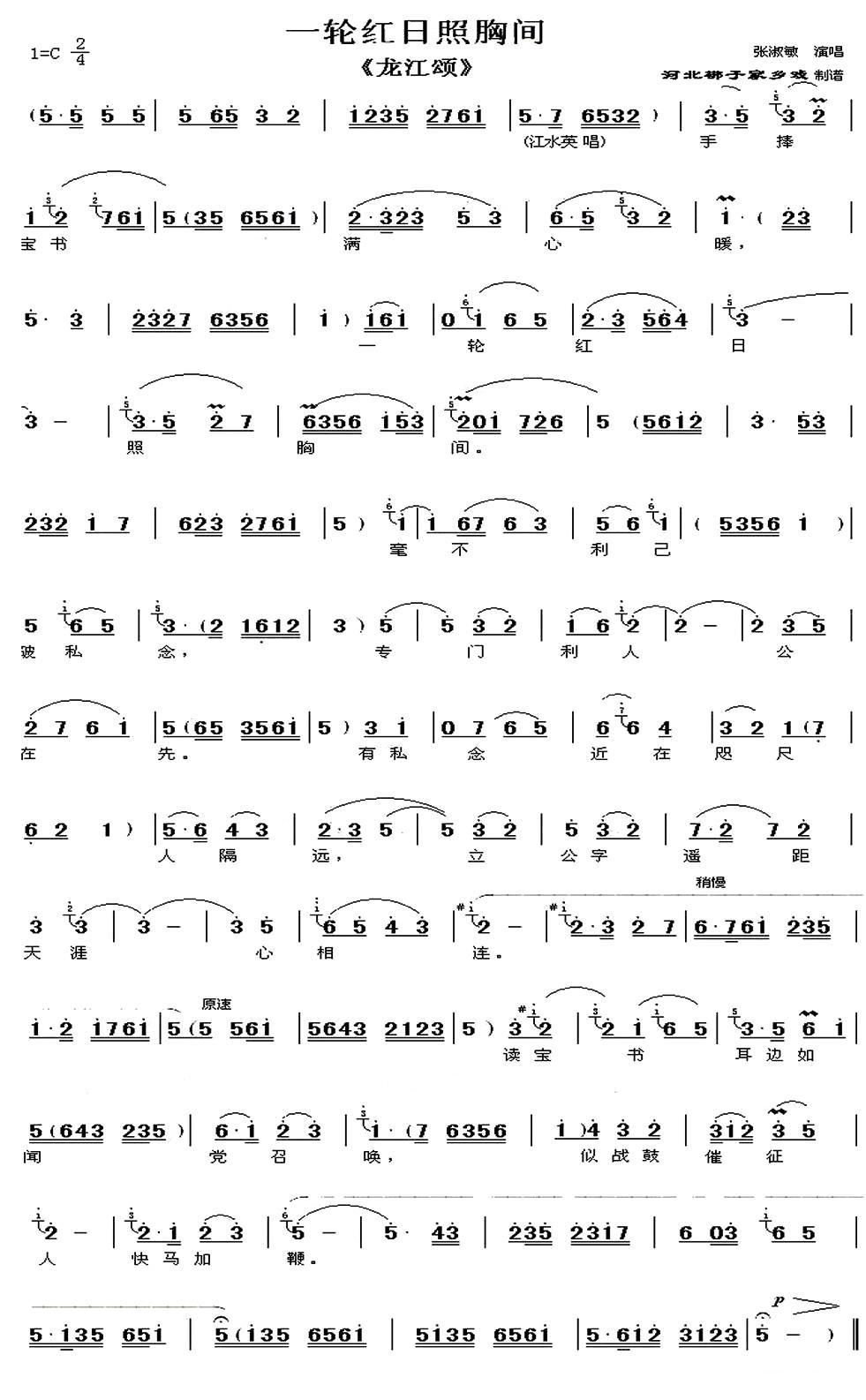 《[河北梆子] 一轮红日照胸间(《龙江颂》选段)》简谱 朱淑敏