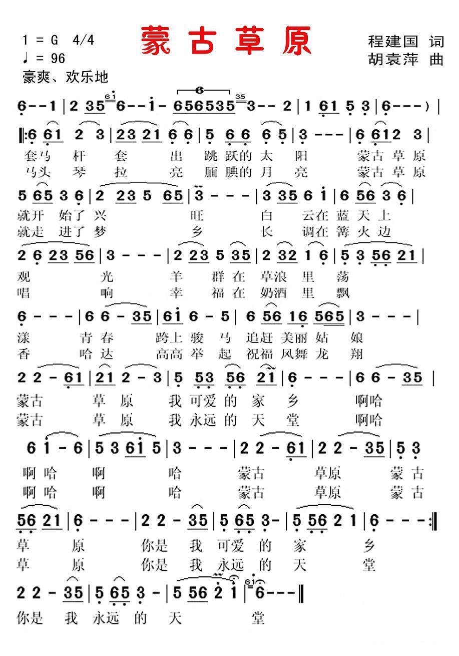 《蒙古草原(程建国词 胡袁萍曲)》简谱