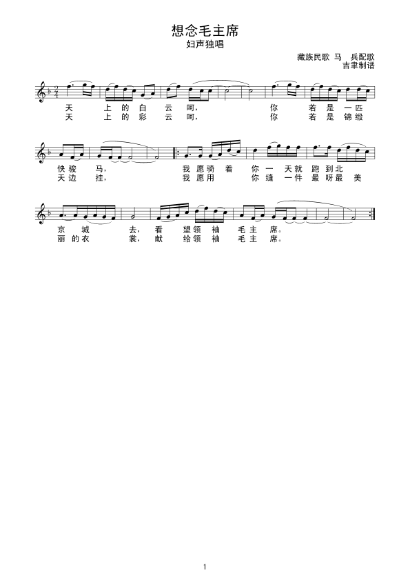 《想念毛主席(藏族民歌)线谱》简谱