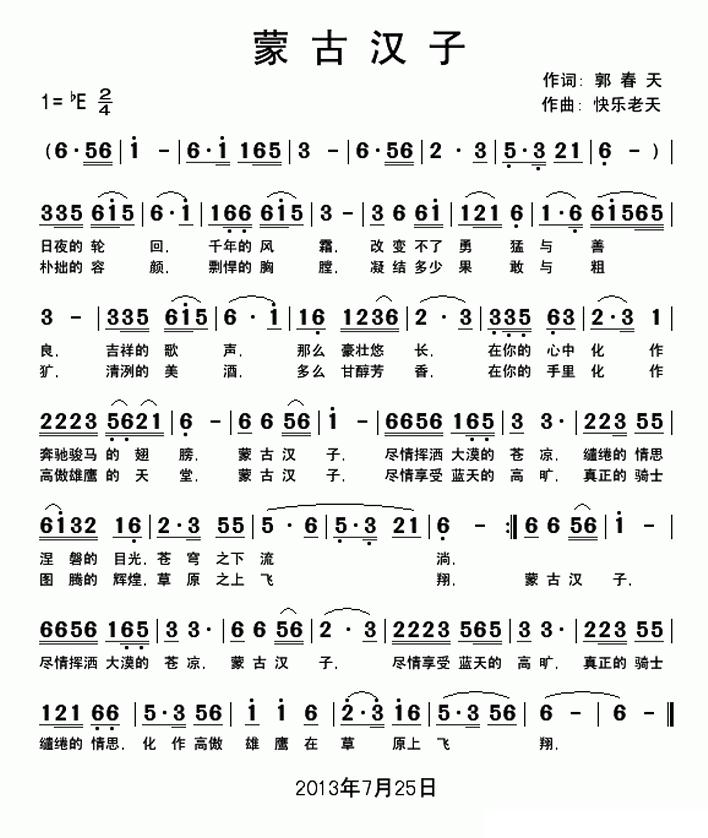《蒙古汉子(郭春天词 快乐老天曲)》简谱 罗锡贵