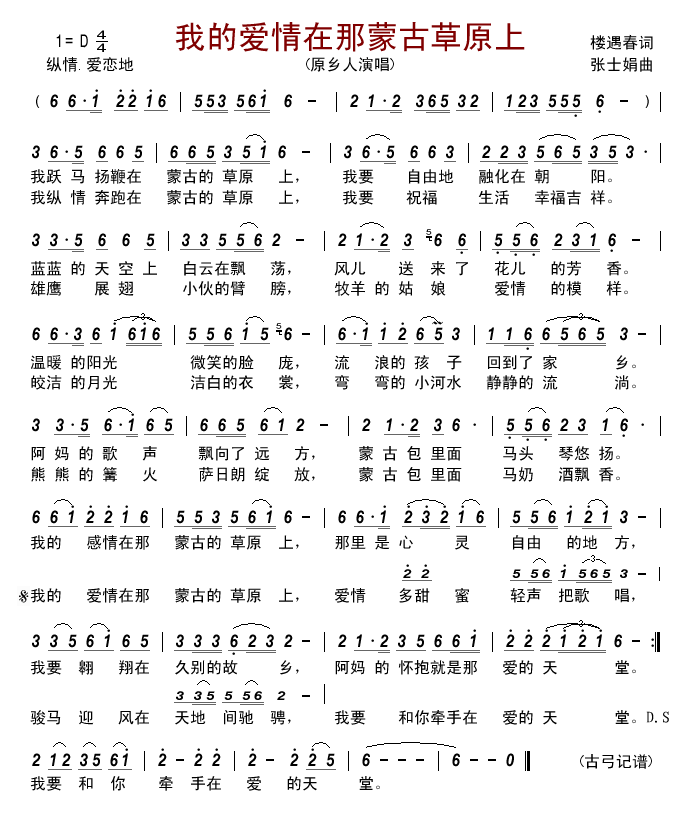 《我的爱情在那蒙古草原上》简谱 原乡人