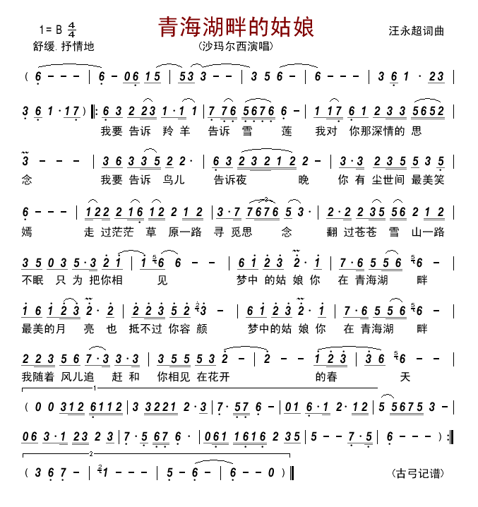 《青海湖畔的姑娘》简谱 沙玛尔西