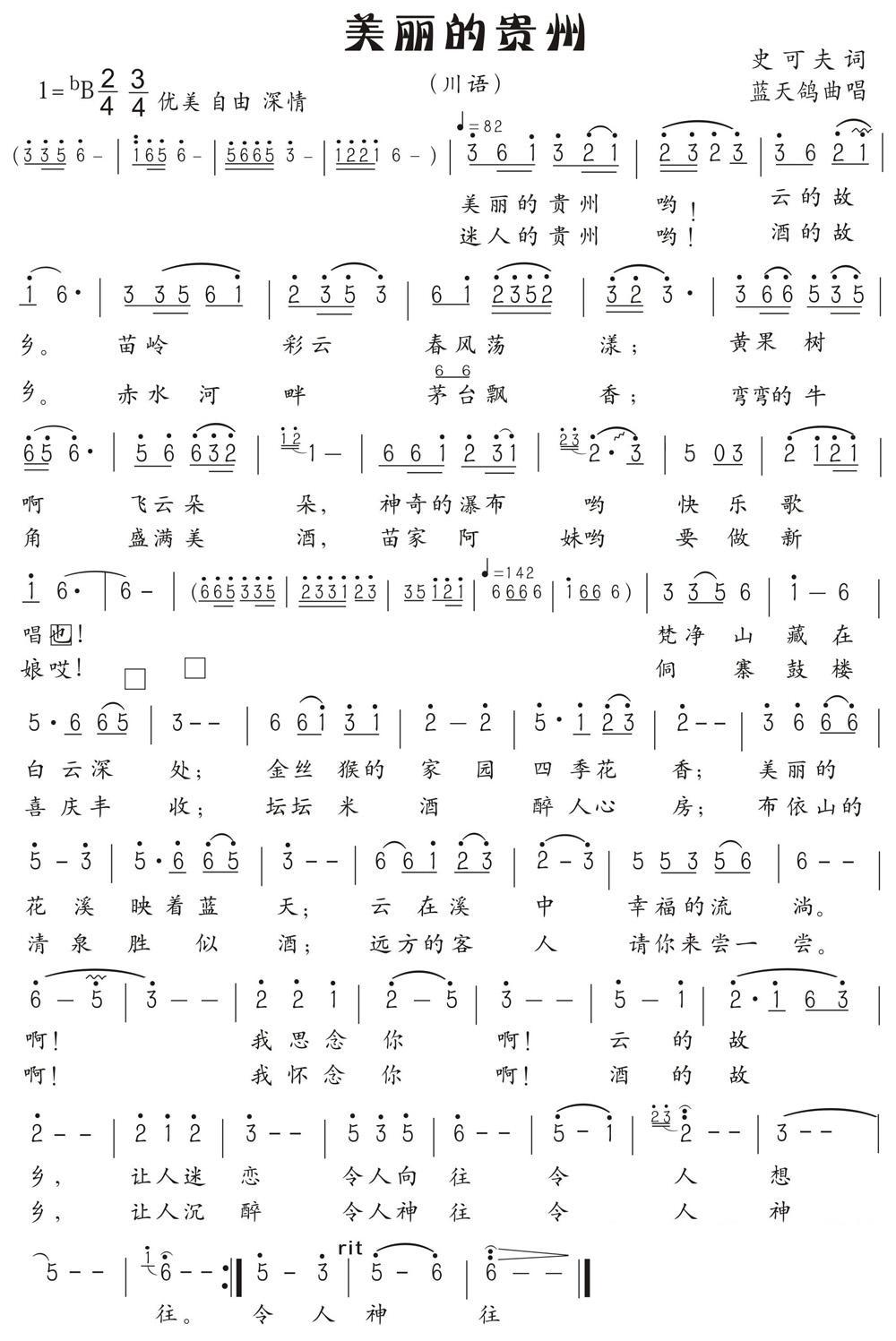 《美丽的贵州(史可夫词 蓝天鸽曲)》简谱 蓝天鸽
