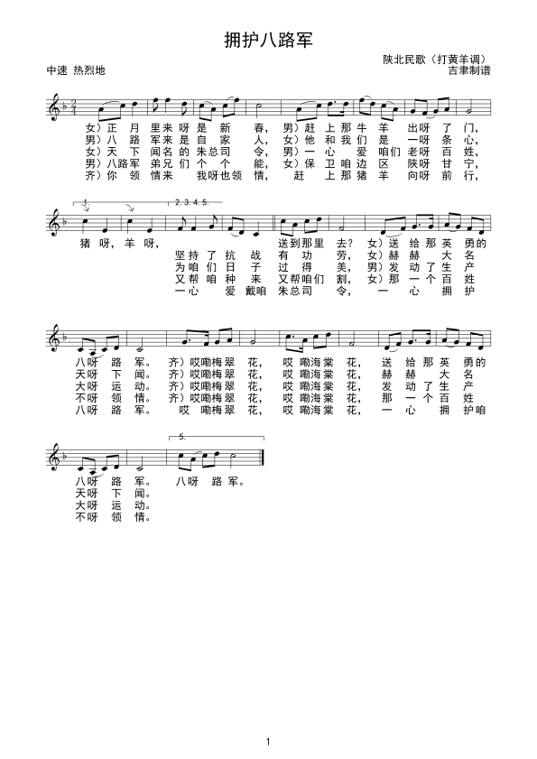 《拥护八路军(内蒙古汉族民歌)线谱》简谱