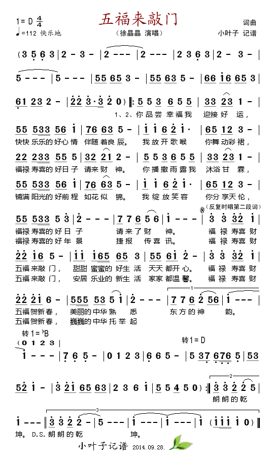 《五福来敲门》简谱 徐晶晶