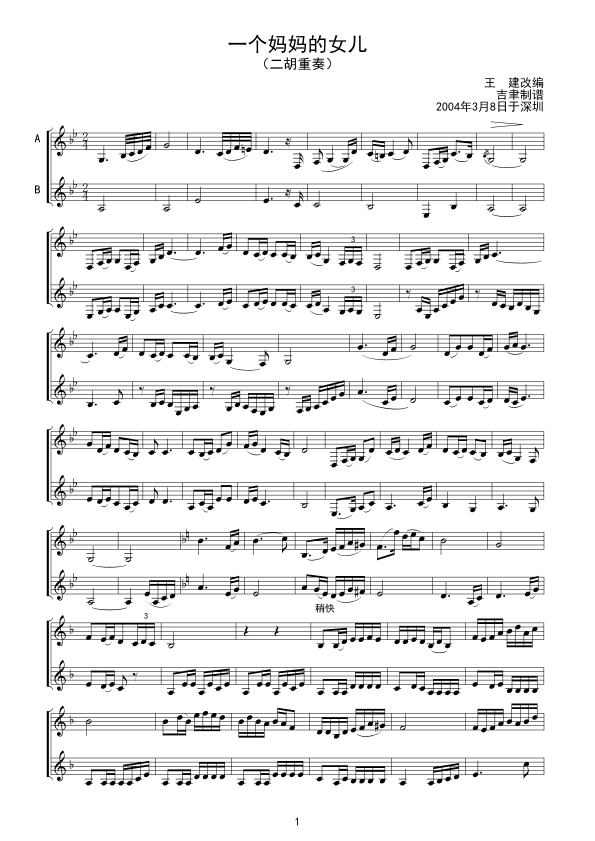 《一个妈妈的女儿(二胡重奏)线谱》简谱