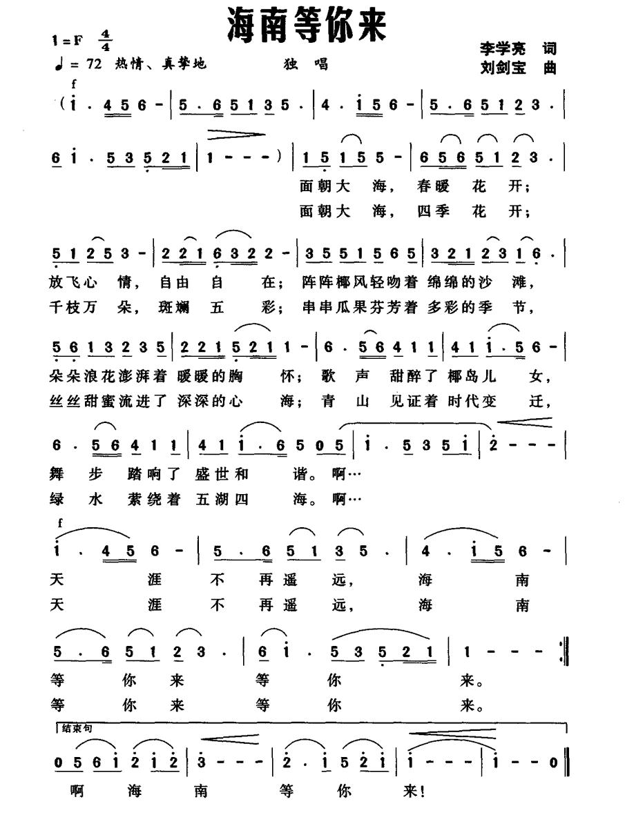 《海南等你来(李学亮词 刘剑宝曲)》简谱