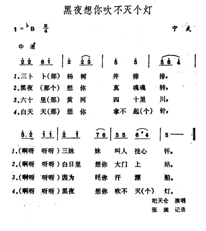 《黑夜想你吹不灭个灯》简谱 山西宁武民歌