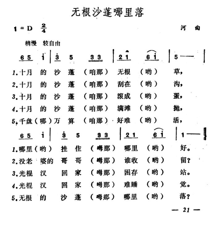 《无根沙蓬哪里落》简谱 山西河曲民歌