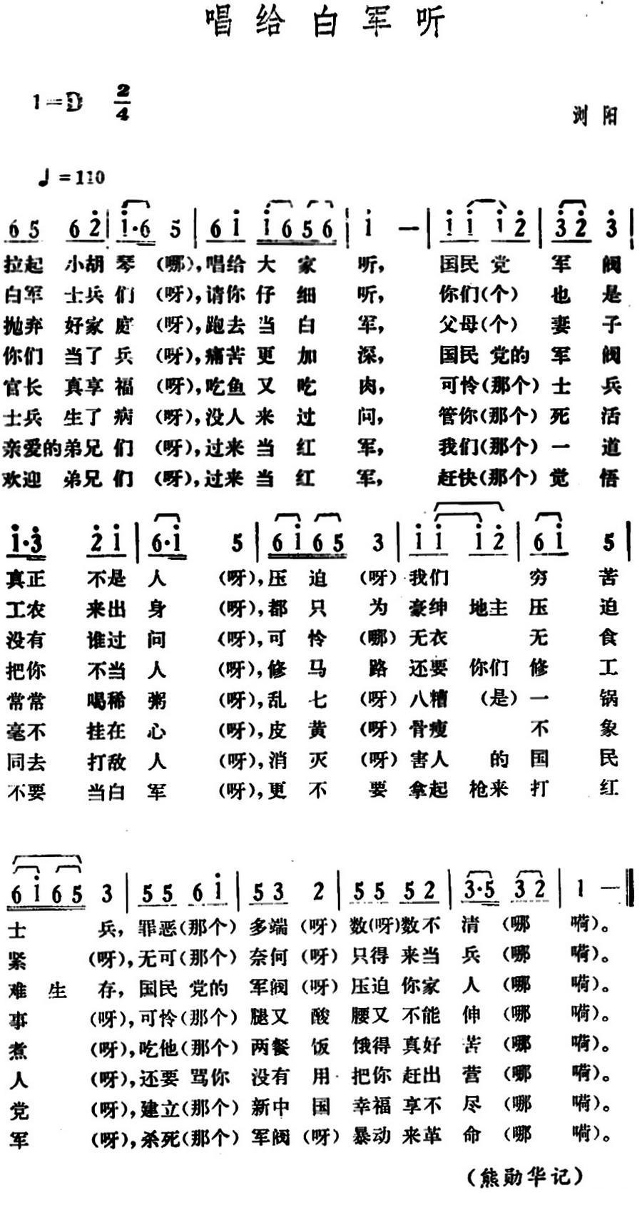 《唱给白军听》简谱 湖南浏阳革命民歌