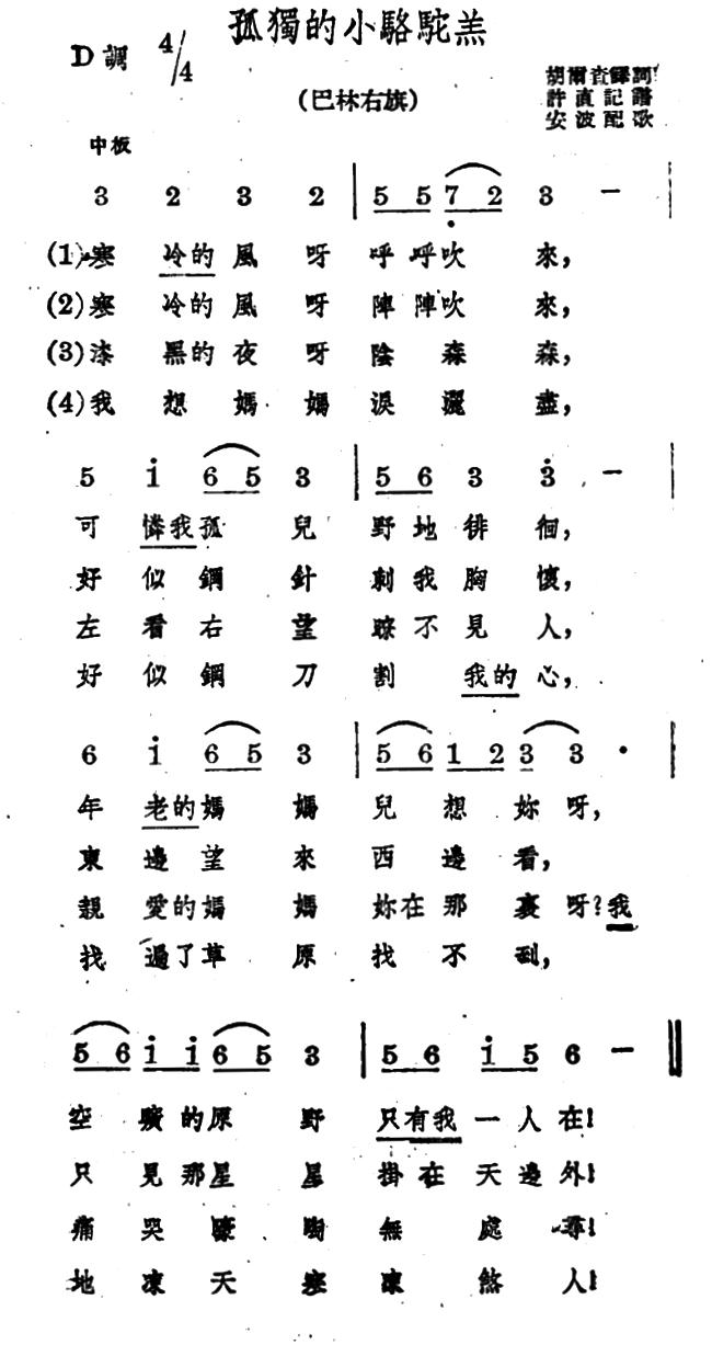 《孤独的小骆驼羔》简谱 蒙古族民歌、安波配歌