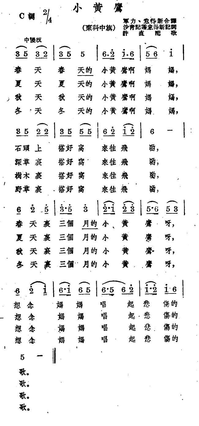 《小黄鹰》简谱 蒙古族民歌、许直配歌
