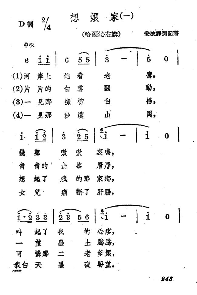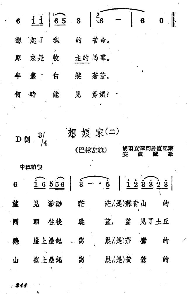 《想娘家(二首)》简谱 蒙古族民歌、安波配歌