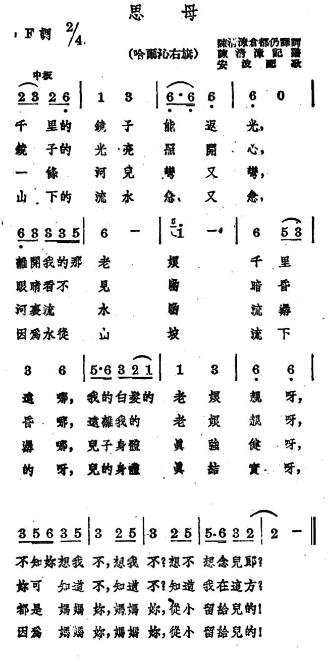 《思母》简谱 蒙古族民歌、安波配歌