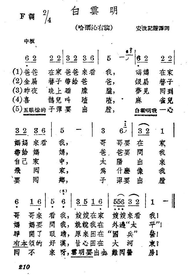 《白云明》简谱 蒙古族民歌、安波记谱译词