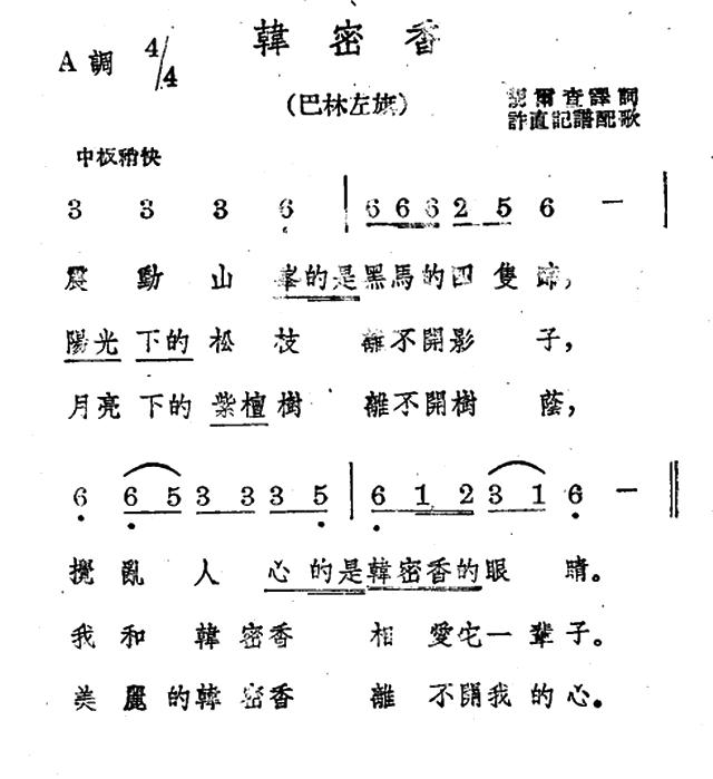 《韩密香》简谱 蒙古族民歌、许直记谱配歌