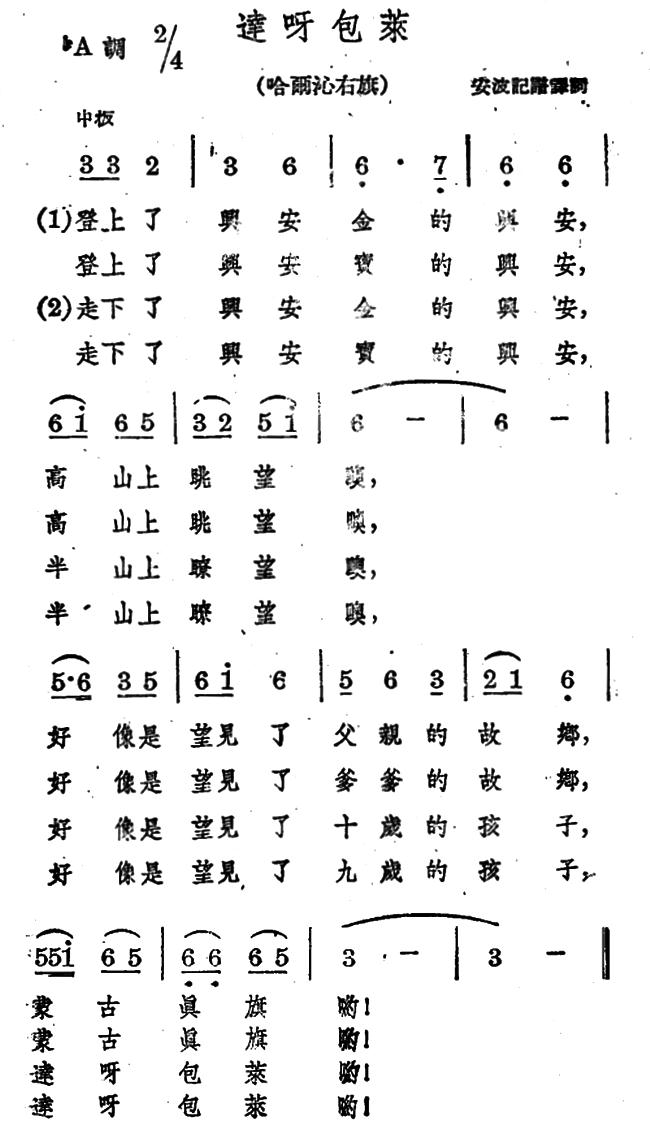 《达呀包莱》简谱 蒙古族民歌、安波记谱译词