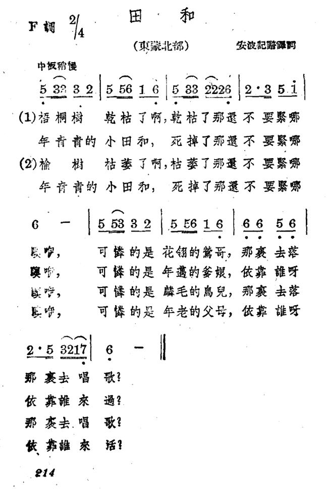 《田和》简谱 蒙古族民歌、安波记谱译词