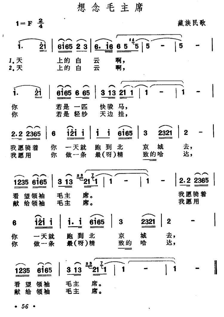 《想念毛主席(藏族民歌、天上的白云版)》简谱