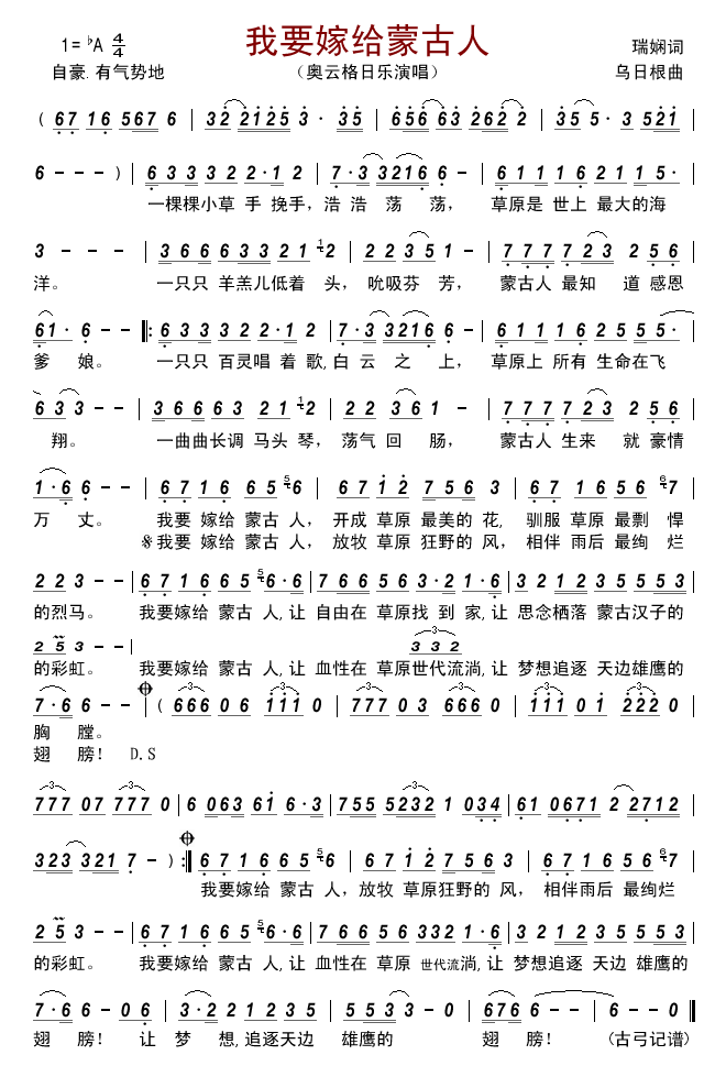 《我要嫁给蒙古人》简谱 奥云格日乐
