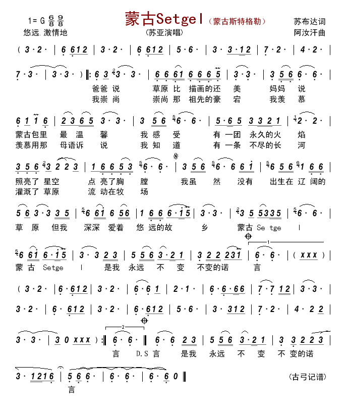 《蒙古Setgel(蒙古斯特格勒)》简谱 苏亚