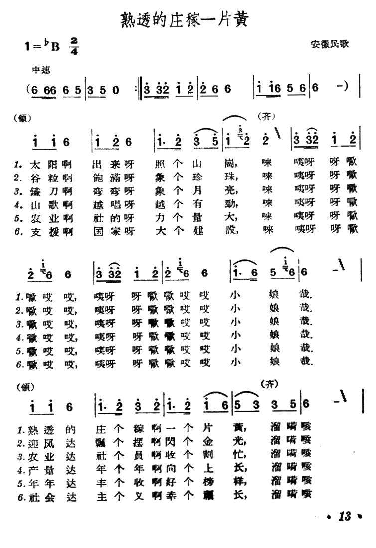 《熟透的庄稼一片黄(安徽民歌)》简谱