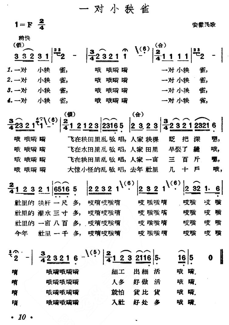《一对小秧雀(安徽民歌)》简谱