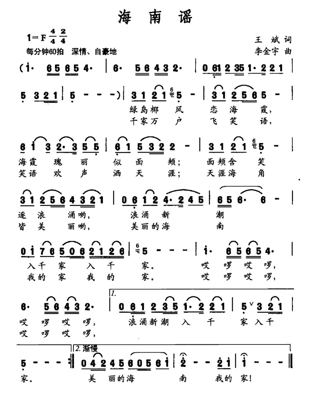 《海南谣》简谱 李金宇