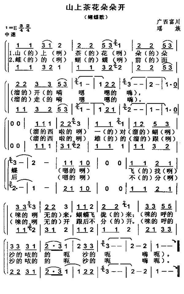 《山上茶花朵朵开(蝴蝶歌)》简谱 广西富川山歌