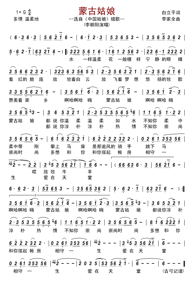 《蒙古姑娘-选自《中国姑娘》组歌》简谱 李朝阳