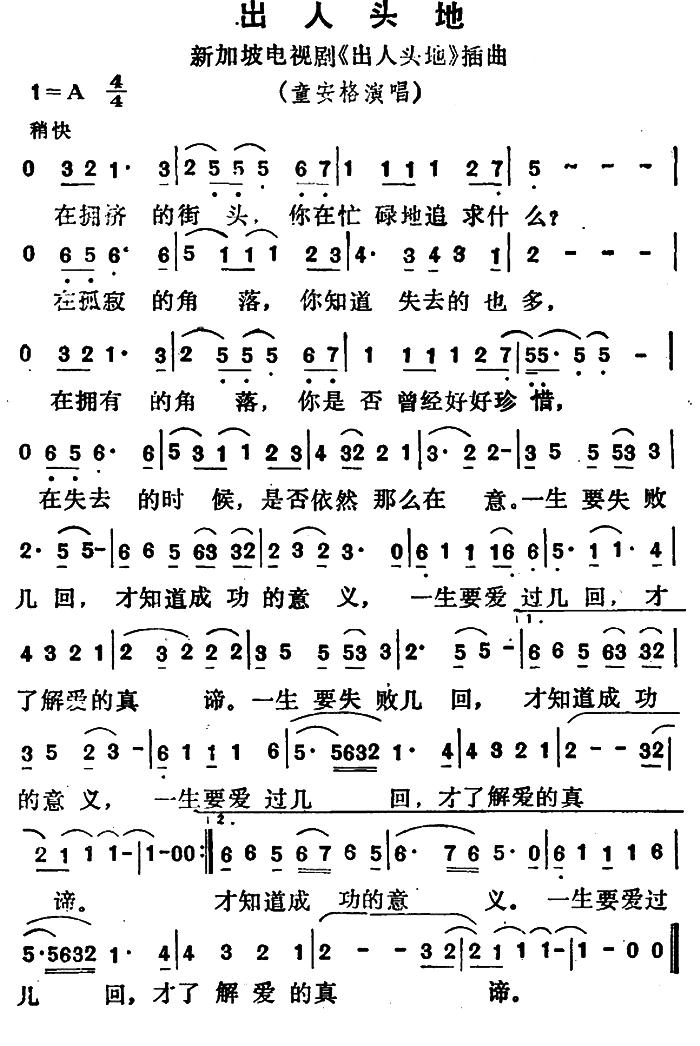 《出人头地(又名:生命过客)(新加坡电视剧《出人头地》插曲)》简谱 童安格