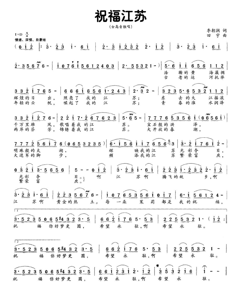 《祝福江苏(李朝润词 田宇曲)》简谱