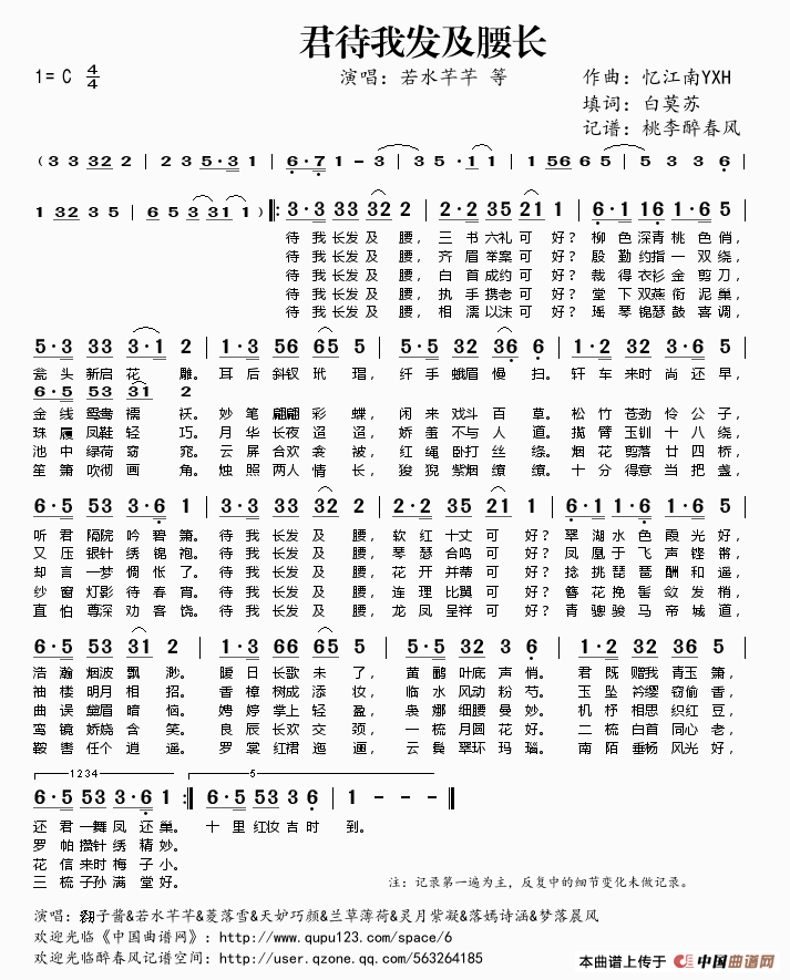 《君待我发及腰长》简谱 若水芊芊