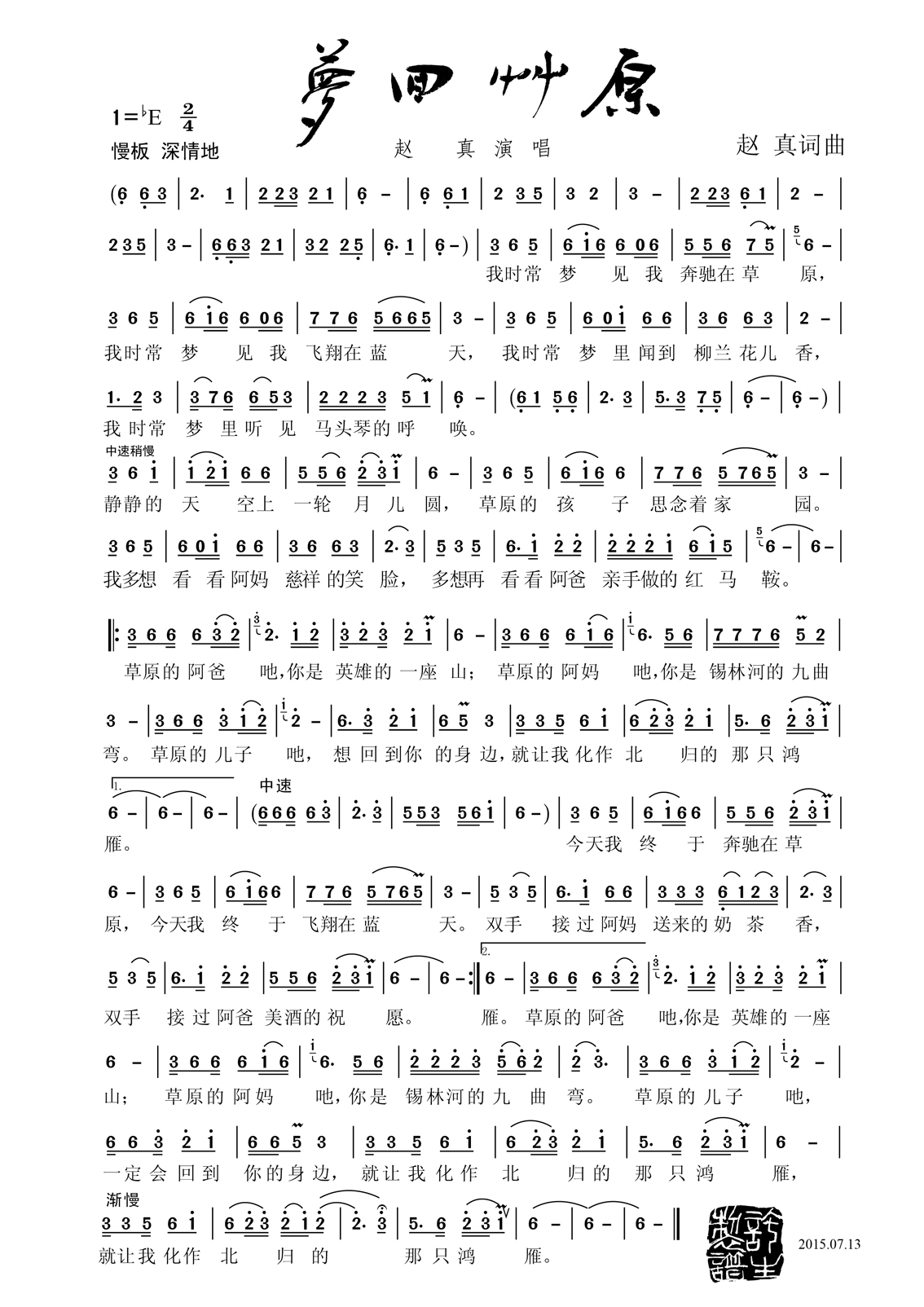 《梦回草原》简谱 赵真