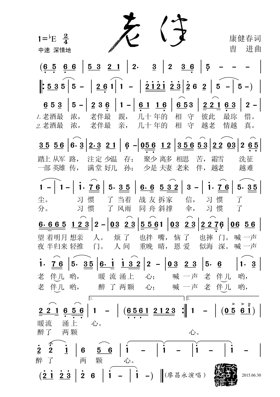 《老伴》简谱 廖昌永