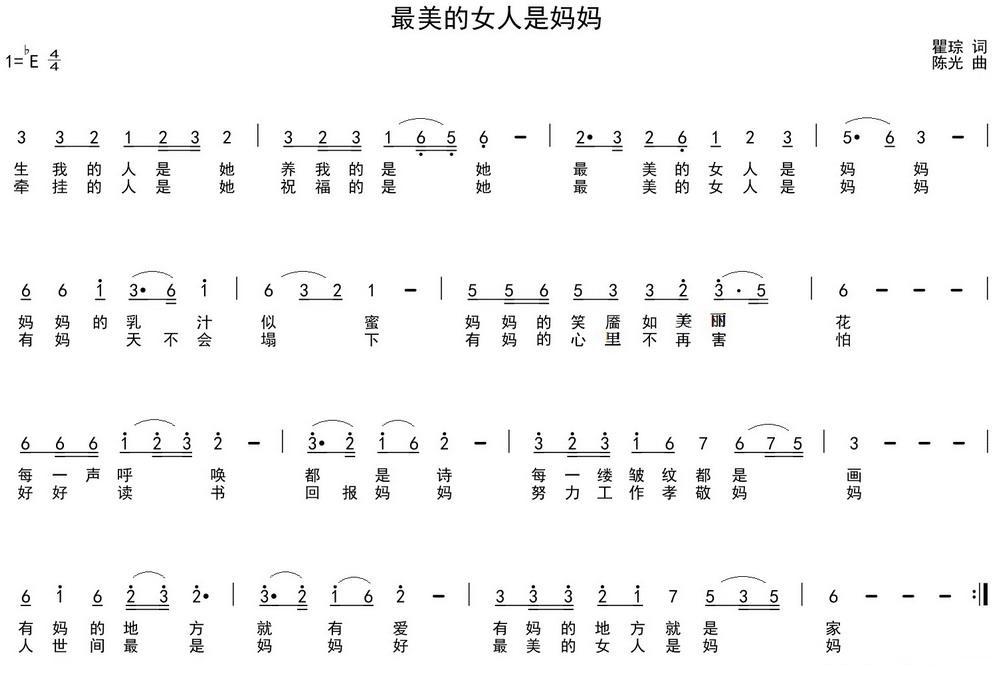 《最美的女人是妈妈(瞿琮词 陈光曲)》简谱