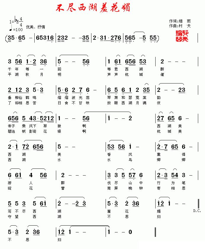 《不尽西湖羞花媚(细雨词 村夫曲)》简谱