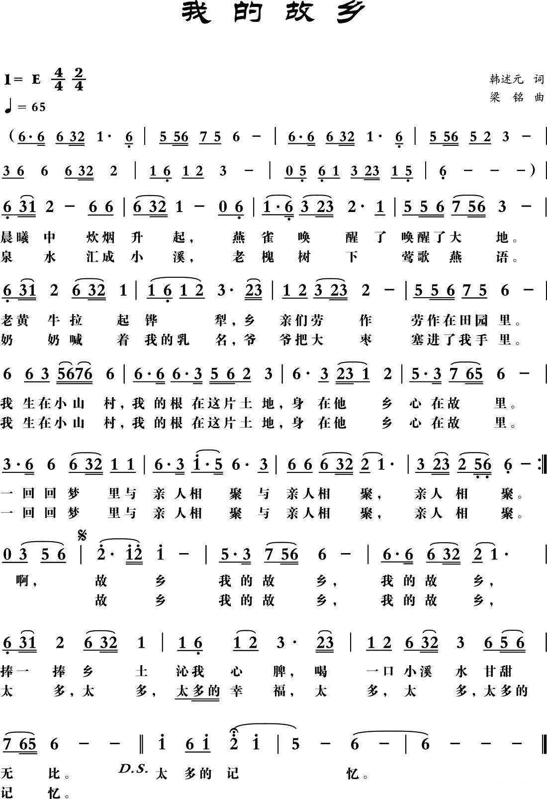 《我的故乡(韩述元词 梁铭曲)》简谱