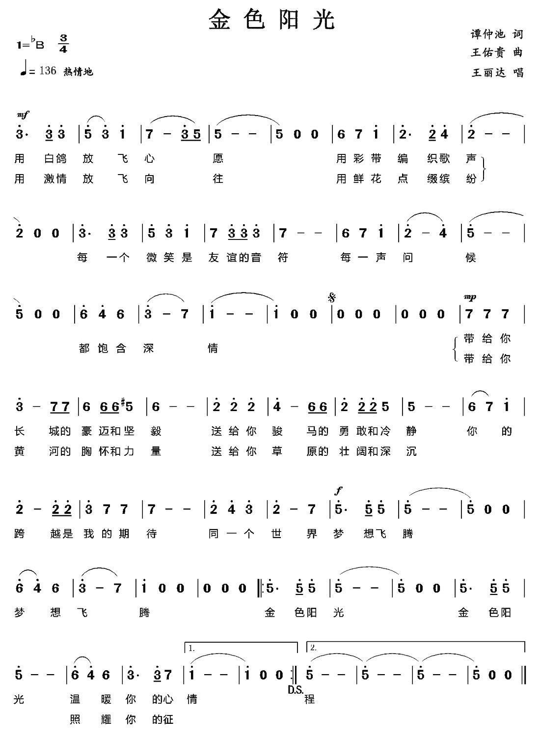 《金色阳光》简谱 王佑贵
