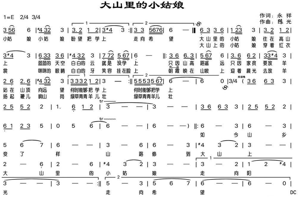 《大山里的小姑娘(永祥词 陈光曲)》简谱