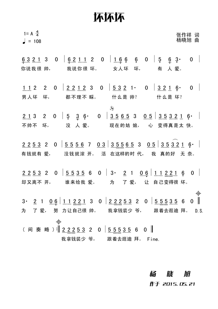 《坏坏坏(张作祥词 杨晓旭曲)》简谱