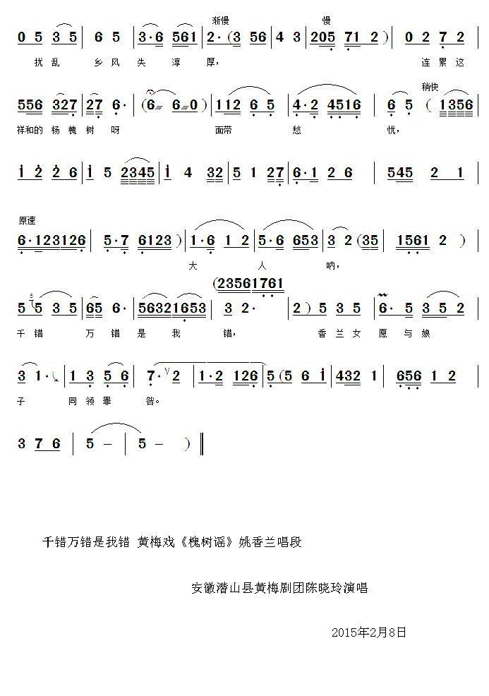 《千错万错是我错(《槐树谣 》姚香兰唱段)》简谱 安徽潜山黄梅剧团 陈晓玲